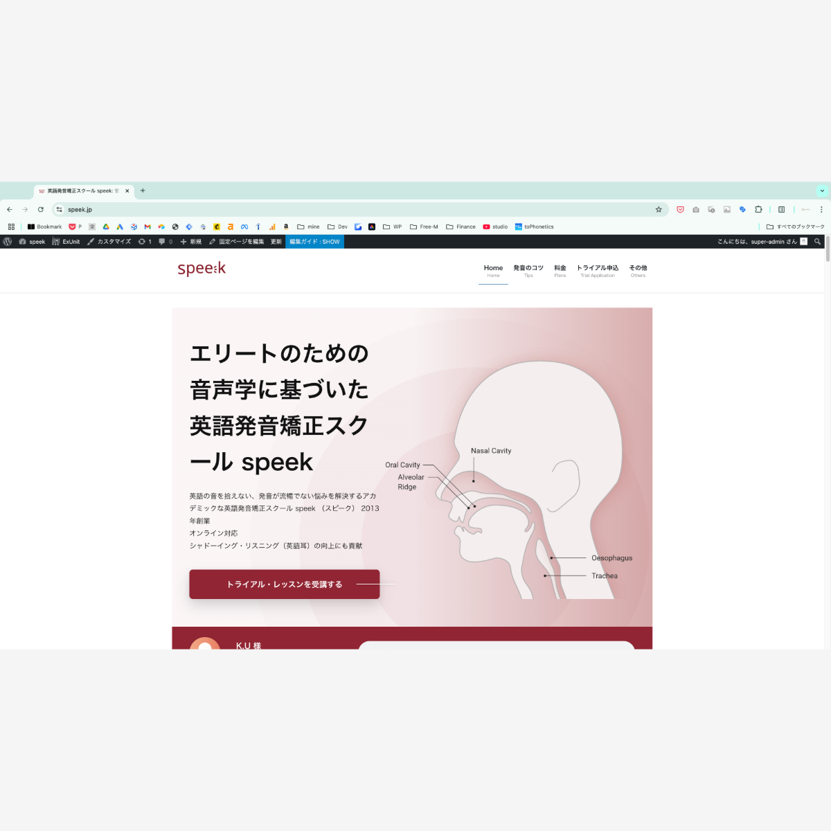 「シャドアカ」は初心者向けのスクールですが、母体は2013年から営業している上級者向け英語発音矯正スクールspeekです。